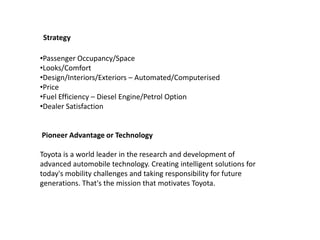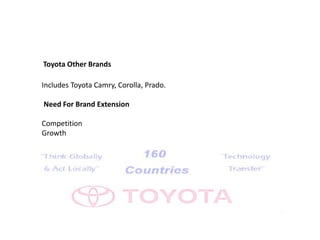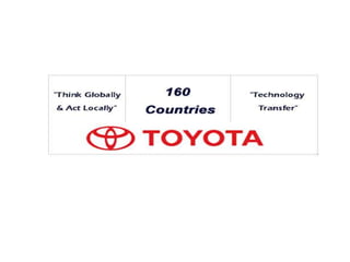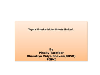 Toyota Kirloskar Motor aims to play a major role in developing India's automotive industry and creating jobs. TKM has focused on putting customers first, which has helped drive its growth while maintaining quality products at reasonable prices. Toyota vehicles are sold globally and are developed to meet local needs in over 160 countries. By 1999, Toyota had produced over 100 million vehicles domestically and over 112 million worldwide, demonstrating its commitment to customer satisfaction.