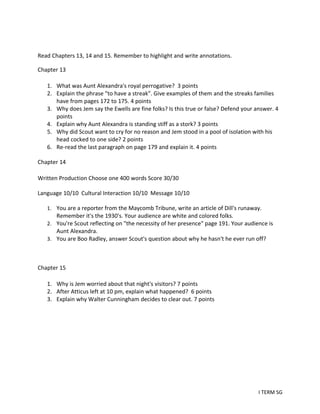 The document provides reading and writing assignments for chapters 13, 14, and 15 of To Kill a Mockingbird. For chapter 13, there are 6 multiple choice questions asking about details in the chapter. For chapter 14, students must choose one of three writing prompts and write a 400 word response as a newspaper article or character reflection. Chapter 15 includes 3 multiple choice questions about events and characters in the chapter. The summary should be concise and focus on the key information that students are being asked to read chapters of a book and respond to comprehension questions and short writing assignments.