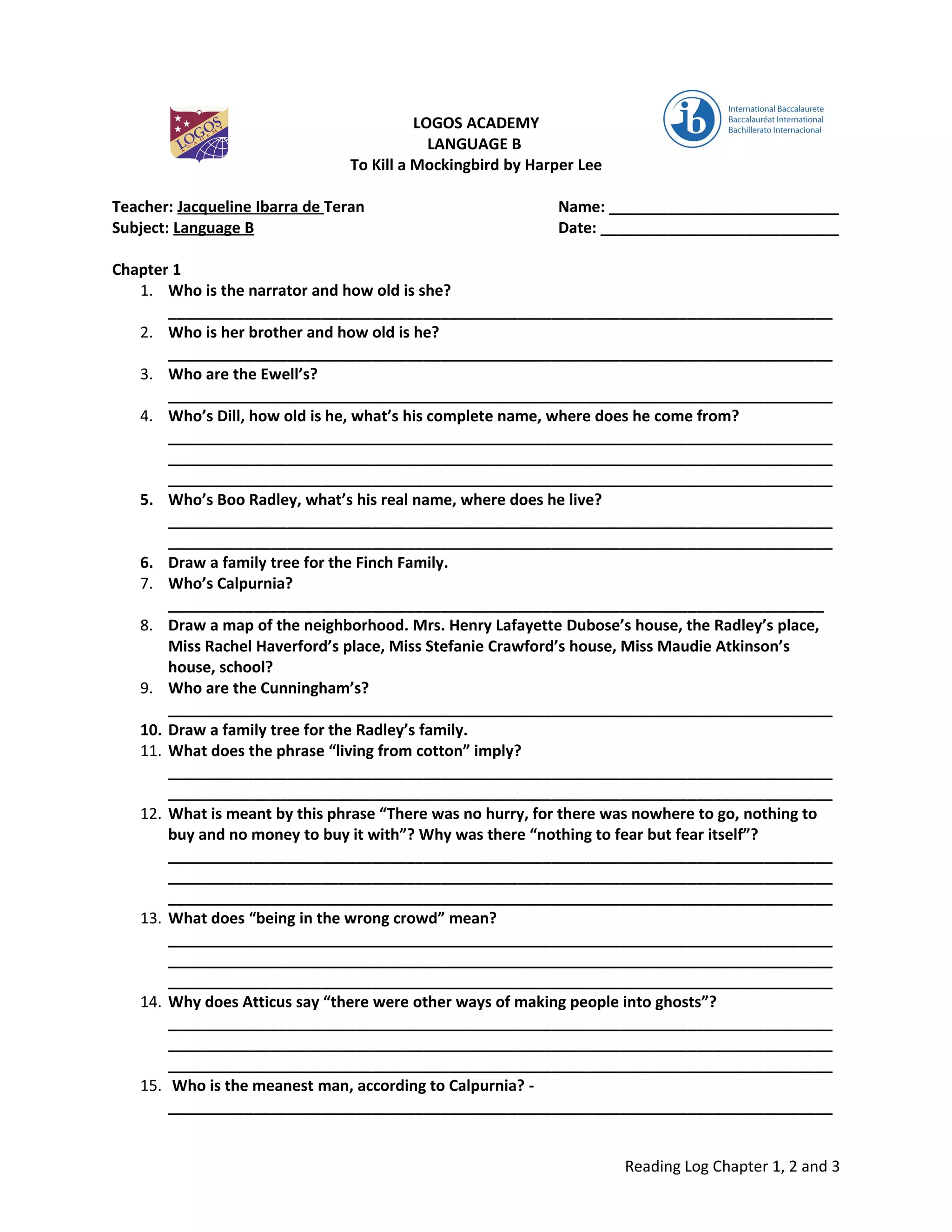The document is a reading log from Logos Academy for chapters 1-3 of To Kill a Mockingbird by Harper Lee. It contains 16 questions about chapter 1, 3 questions about chapter 2, and 2 questions about chapter 3 for the student to answer. The questions probe the student's understanding of characters, events, themes and analysis of the chapters. The student is asked to provide summaries, definitions, comparisons and inferences based on their reading.