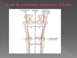 The knee is made up of four bones that interact in two joints: the tibiofemoral and patellofemoral joints. These joints allow flexion/extension, rotation, and translation while providing load transfer. The knee flexes from 0-135 degrees, and the femoral condyles translate posteriorly during flexion. The tibia externally rotates in extension and internally rotates in flexion, locking the knee. Larger Q angles increase risk of lateral patellar subluxation. Forces through the knee increase with activity from 0.3 times body weight while walking to 7 times body weight while squatting.