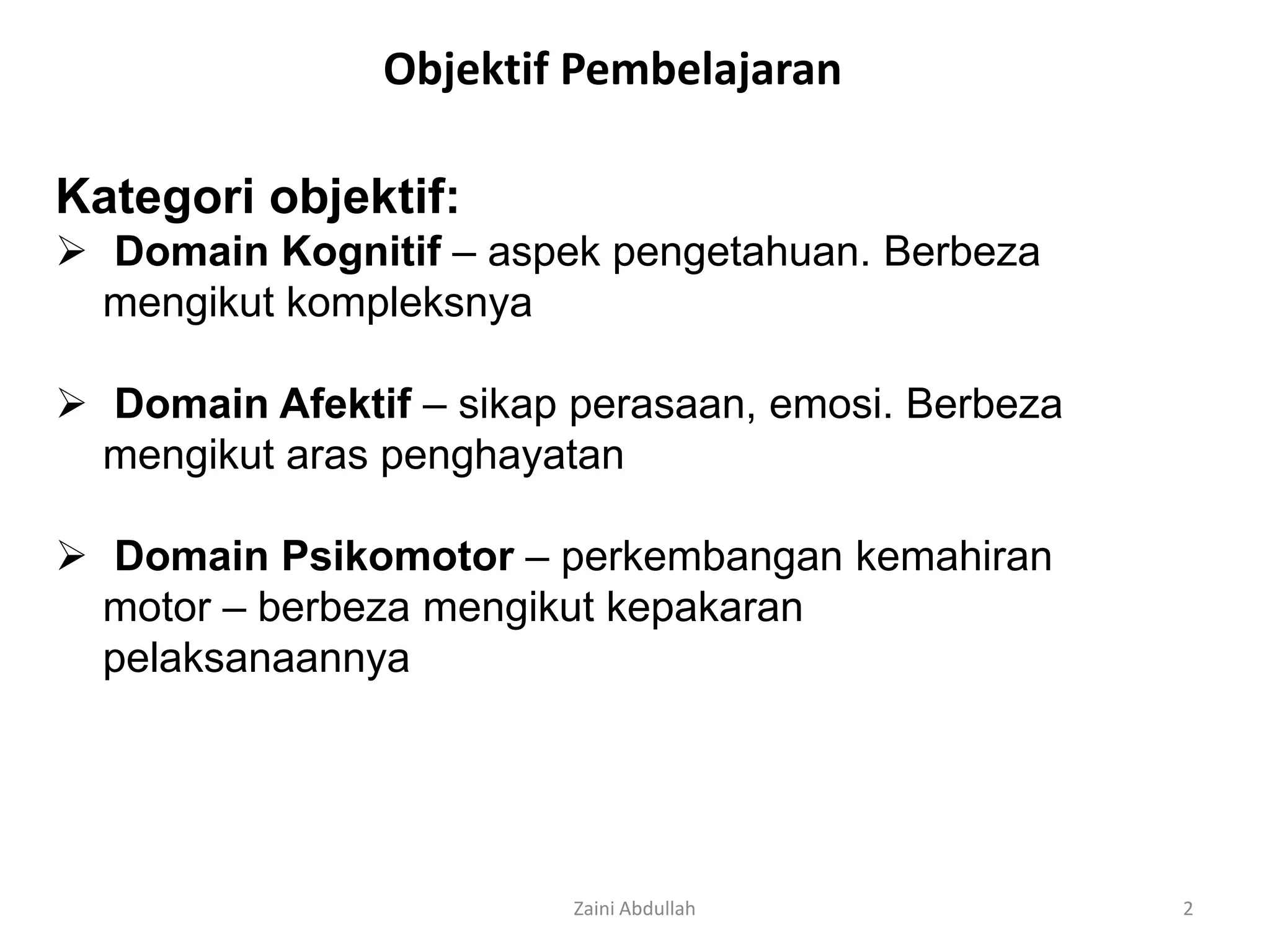 Dokumen ini membahas taksonomi objektif pendidikan, termasuk taksonomi Bloom dan taksonomi Solo, yang mengklasifikasikan objektif pembelajaran ke dalam domain kognitif, afektif, dan psikomotor. Setiap domain dapat dikelompokkan ke dalam berbagai tingkat dari pengetahuan dasar hingga penilaian kritis, mencakup aspek seperti mengetahui, memahami, menerapkan, menganalisis, mensintesis, dan mengevaluasi. Selain itu, terdapat juga penjelasan mengenai cara mendefinisikan hasil pembelajaran dalam konteks pendidikan.
