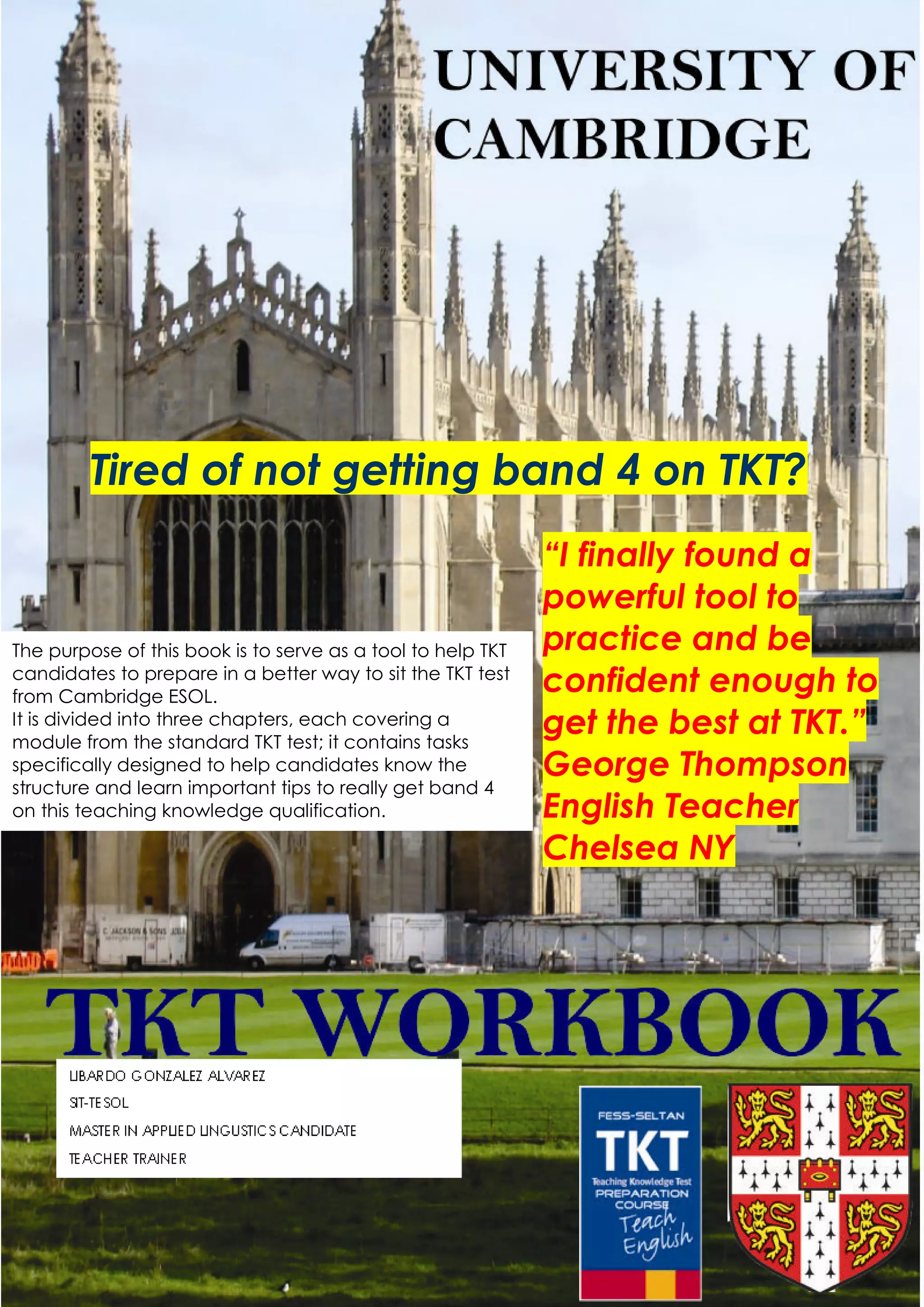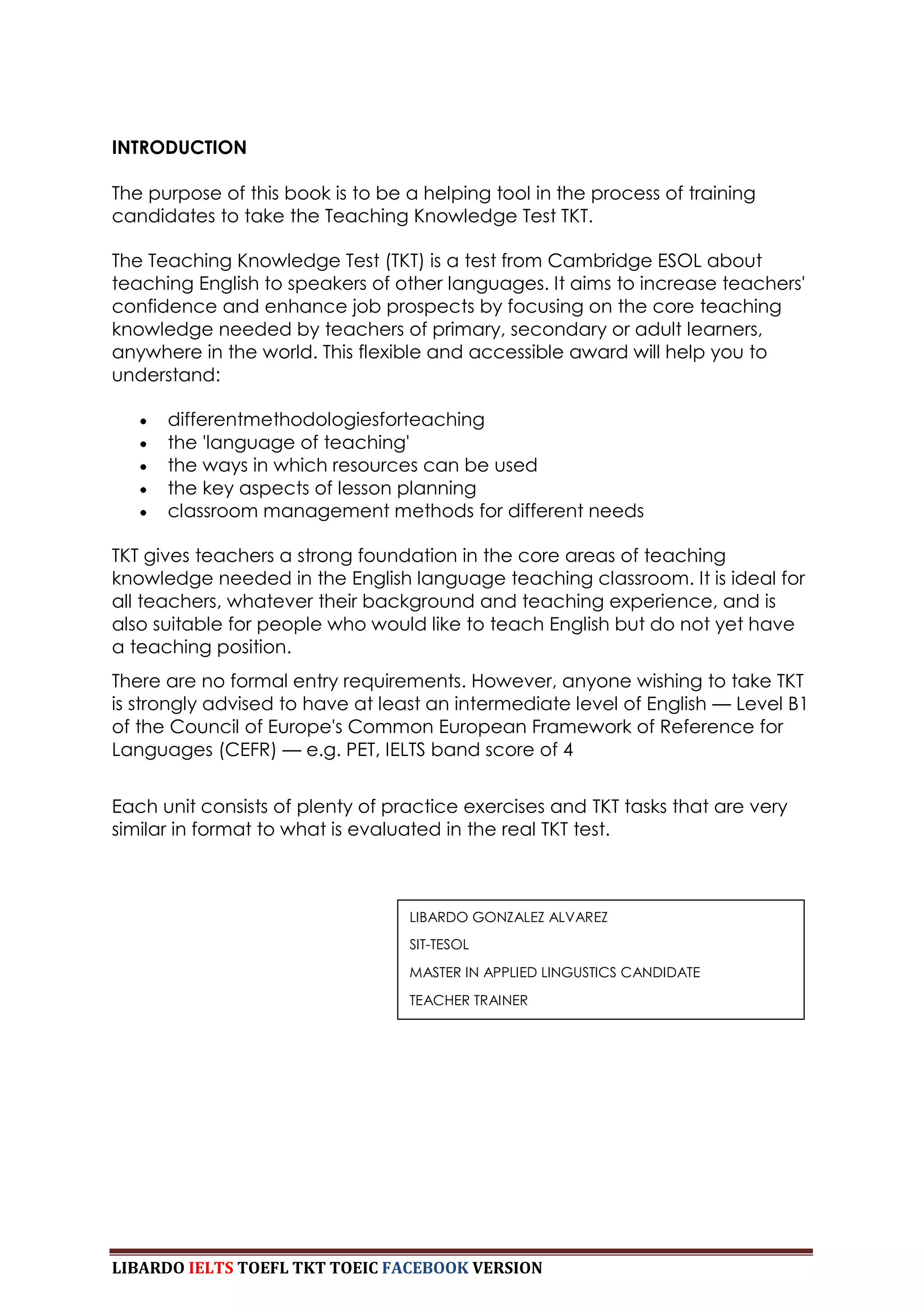 The document provides information about a book that aims to help candidates prepare and do well on the TKT (Teaching Knowledge Test) exam. The book is divided into three chapters that correspond to the three modules on the TKT exam. It contains practice exercises and tasks similar to those on the real TKT exam to help candidates understand the structure and learn tips to achieve the highest band score of 4. An English teacher from New York is quoted saying this book was a powerful tool that helped him feel confident enough to get band 4 on the TKT exam.