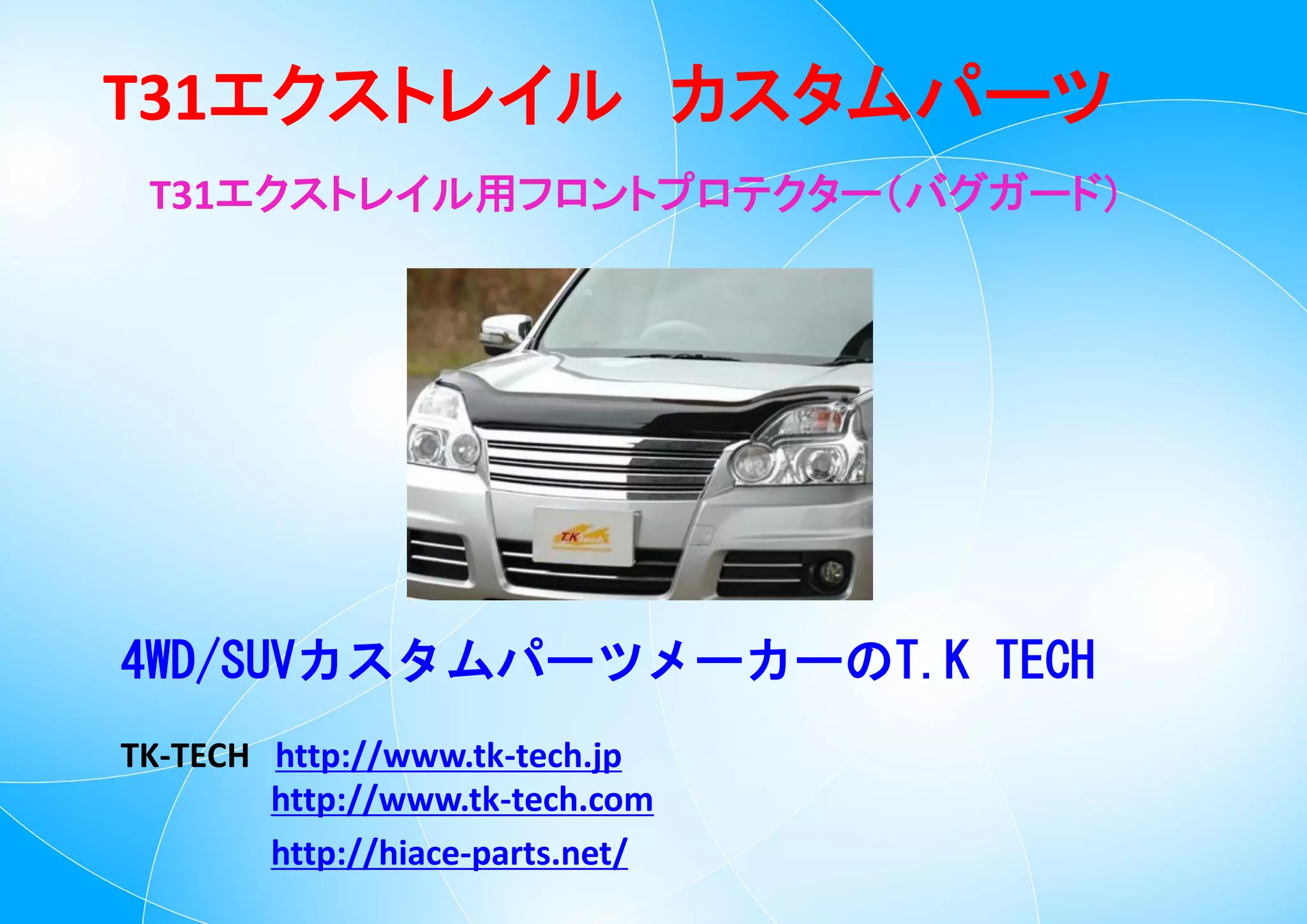エクストレイルT31用のフロントプロテクター(バグガード)の紹介。 虫よけ効果などの説明や取付やアフターさビスなどの違いまでを紹介しております。 T31エクストレイルのカスタムパーツ by T.K TECH(TKテック)