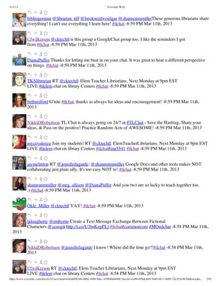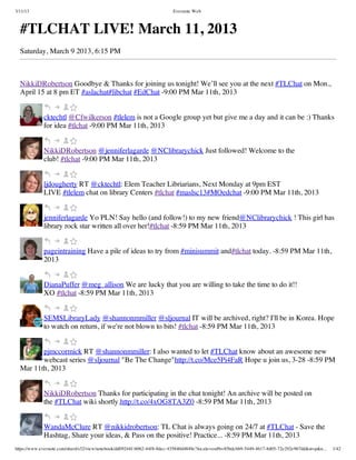 This document summarizes the Twitter conversation from the #TLChat discussion on March 11, 2013. Various participants announced upcoming events and shared resources. They also discussed the importance of collaboration between teachers and librarians, and building personal relationships to encourage collaboration. The conversation covered a wide range of topics in a short period of time.