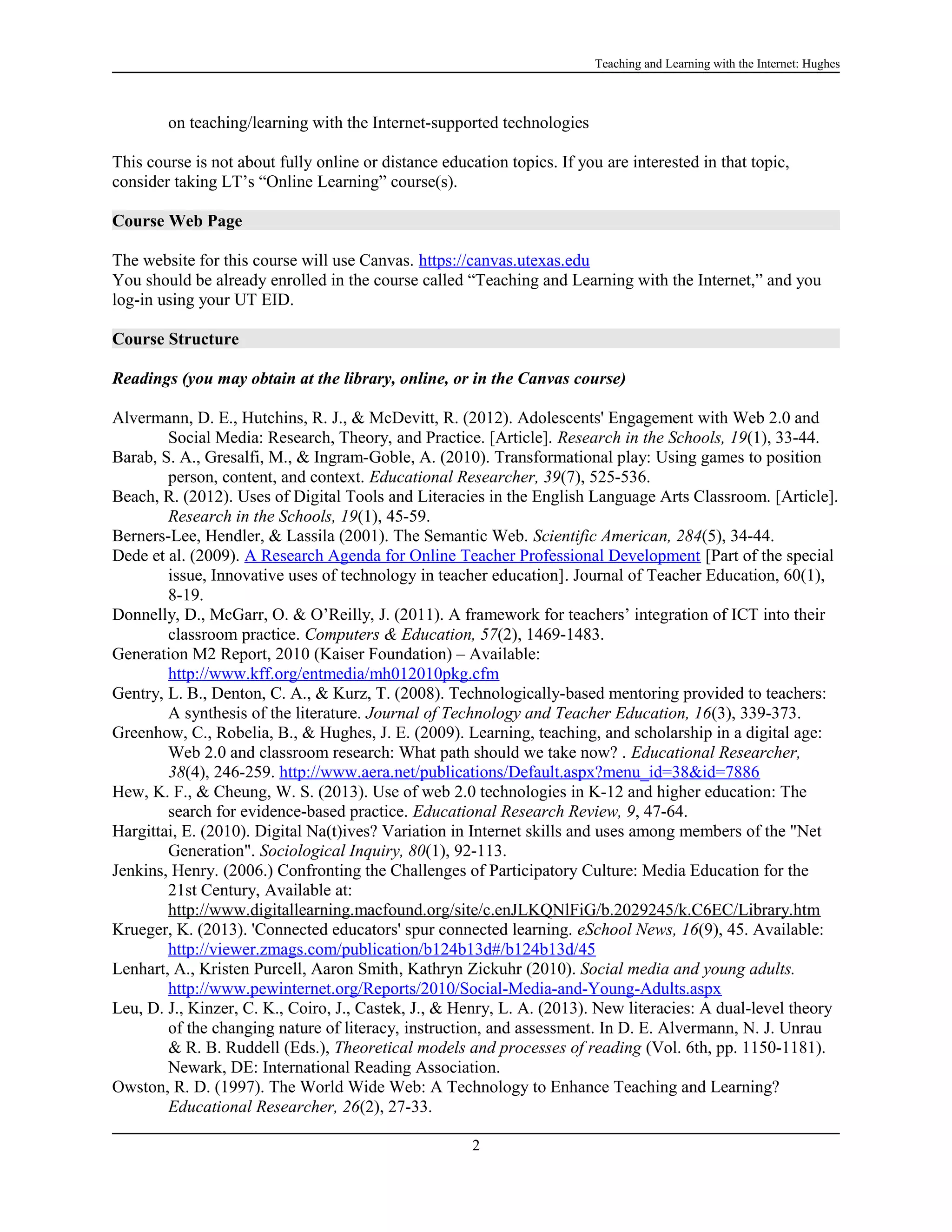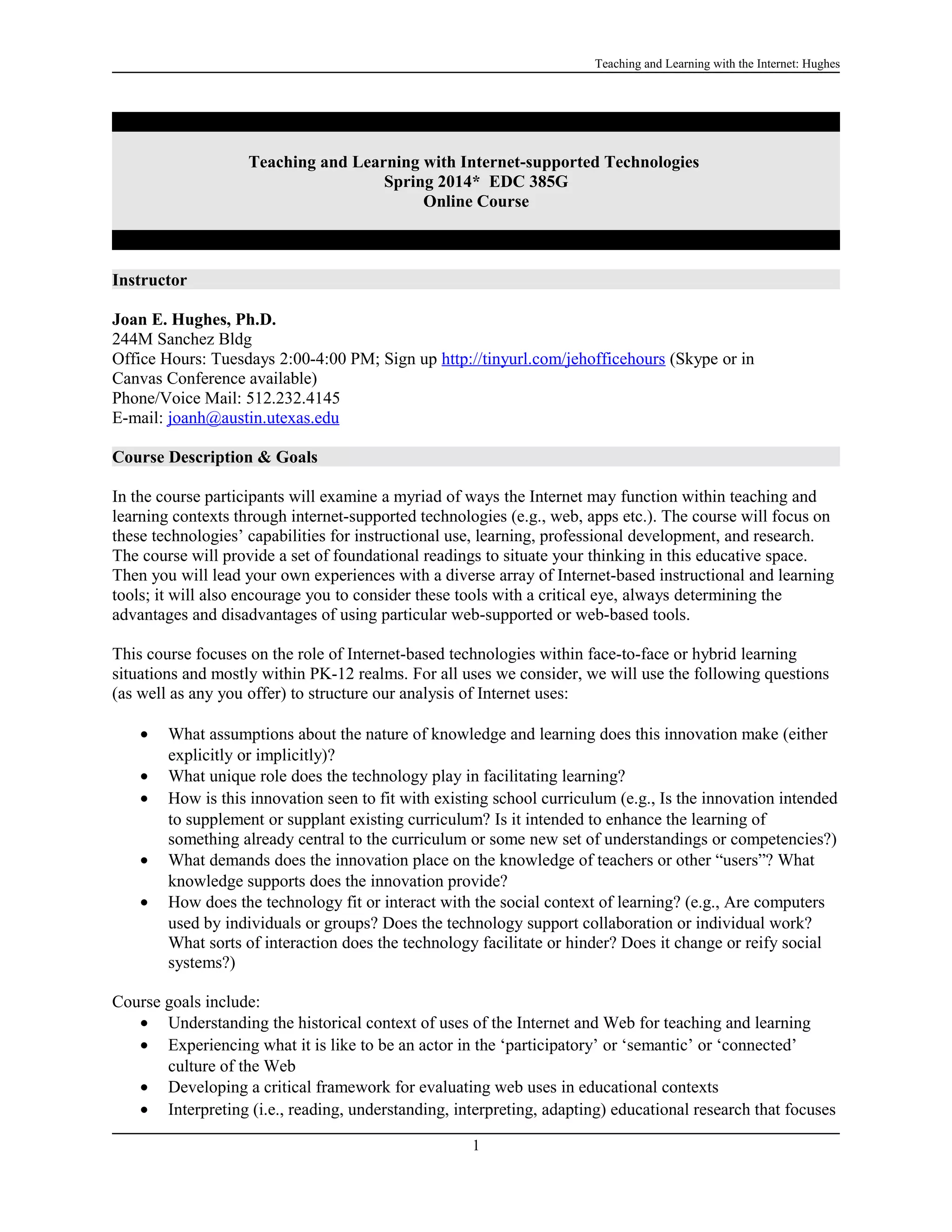 The document outlines a course on teaching and learning with internet-supported technologies, focusing on their instructional use and critical evaluation within PK-12 education settings. It covers course goals, required readings, assignments, technology needs, and performance outcomes, while emphasizing engagement in discussions and hands-on experiences. Participants will critically analyze the role of internet-based tools in enhancing educational practices and collaborate in a learning community.