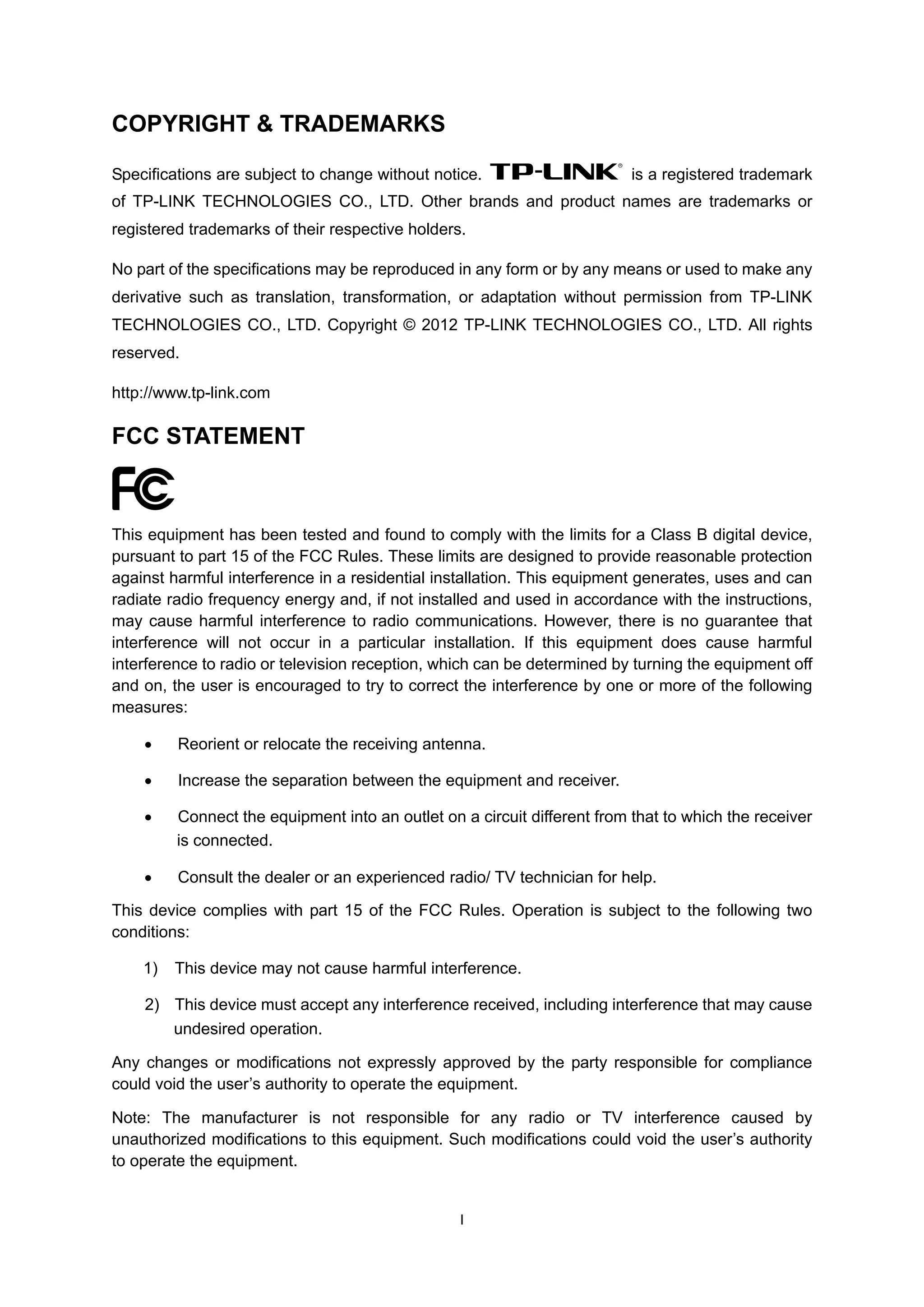 - Copyright and trademark information for TP-LINK TECHNOLOGIES CO., LTD.