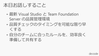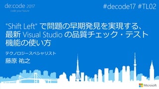 DevOps のプラクティスでもある ”Shift Left” を実現するために、最新版の Viual Studio と Team Foundation Server には開発における品質チェックを初期のフェーズにシフトすることが可能な機能が実装されています。 本セッションでは、「Live 依存関係チェック」「静的ソースコード分析ルールの作成と最新の管理方法」「Live Unit Testing」「ビルド時のテスト依存関係チェック」などをデモによって紹介します。