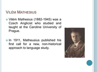 The document discusses the contributions of prominent figures in the Prague School of functional linguistics, highlighting the works of Vilém Mathesius, Nikolai Trubetzkoy, André Martinet, and Roman Jakobson. It emphasizes their innovative approaches to language study, focusing on phonology, the functions of speech, and the analysis of linguistic components. The document provides insights into how their theories have shaped modern linguistics and the understanding of phonological systems.