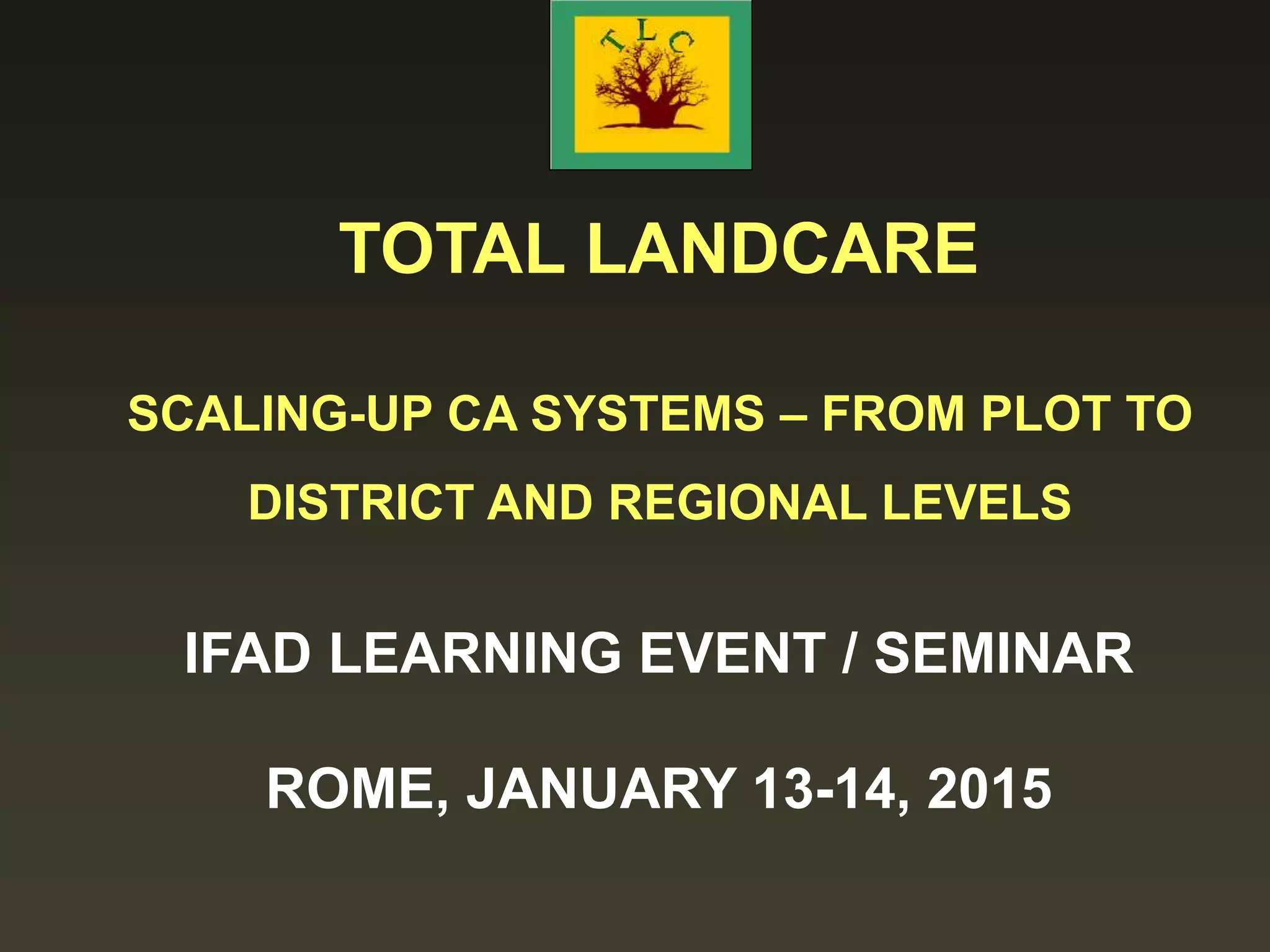 The document discusses the scaling-up of conservation agriculture (CA) systems by Total LandCare in Malawi, highlighting the development, challenges, and successful strategies for adoption. Key principles include minimal soil disturbance, crop rotation, and effective use of cover crops to improve yields and soil health, while addressing challenges like resistance to change and conflicting policies. The document outlines a strategy for increased productivity through farmer training, integration with agroforestry, and improved access to markets.