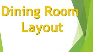 This document discusses the proper preparation and layout of a dining room, including arranging the dining area to be inviting and comfortable for guests, setting tables with the proper appointments and accessories, and designating specific areas for serving food, drinks, and seating customers to pay bills. Proper preparation involves knowledge of dining room attendants, busboys, and waiters to efficiently serve customers and achieve the desired dining experience.