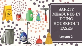 This document outlines various safety measures for household tasks and material handling. It discusses keeping work areas neat and hazard-free, as well as employers providing suitable safety information and training to workers. Specific tips are provided for safely lifting, carrying, and handling materials, including using proper technique, getting assistance for heavy loads, and protecting your back. Power lifting guidelines include sizing up loads, maintaining good posture, and lifting with legs rather than back. The document stresses teamwork, communication, and personal protective equipment for safety.