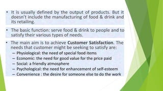 The document discusses different types of food and beverage service operations. It describes 12 types of establishments including bistros, bars, coffee shops, restaurants, cafeterias, pubs, and wine bars. It provides brief definitions and examples for each type of establishment, noting what foods and drinks they typically serve and their atmosphere. The overall document serves to classify and define various food service business models.