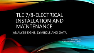 This document discusses analyzing electrical signs, symbols, and data. It defines common electrical symbols used in schematic diagrams and plans. Examples of electrical symbols, signs like voltage danger and electrical hazard, and different types of circuits like series and parallel are shown. The document also discusses interpreting technical drawings like pictorial diagrams, schematic diagrams, and electrical plans. It provides an example of matching electrical symbols and counting fixtures from an electrical plan.