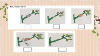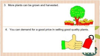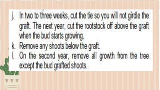 This document provides information about propagating fruit-bearing trees using scientific processes. It discusses the importance of proper planning, layout, and selection of land area when establishing an orchard. It also outlines several scientific propagation methods like grafting, budding, marcotting, inarching, and layering. Following these scientific processes ensures increased productivity, less plant mortality, and greater profit from higher quality fruit harvests. Safety and healthy practices are also important, such as using the right tools, wearing protective equipment, and applying organic fertilizers over commercial ones.