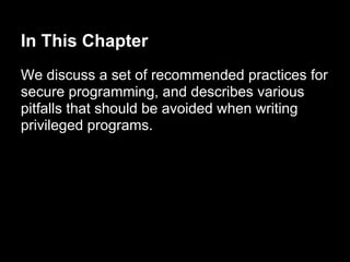 This document discusses guidelines for securely writing privileged programs. It recommends operating with least privilege by dropping privileges when they are not needed and reacquiring them only as required. It also recommends confining the process using capabilities or chroot jails, being careful of signals and race conditions, avoiding buffer overflows, and checking return values of system calls. The overall aim is to minimize the chances of a privileged program being subverted and to minimize potential damage if subversion occurs.