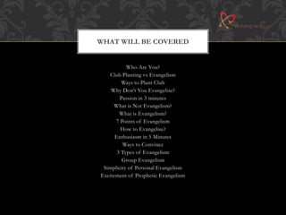 This document provides an overview and schedule for an evangelism gathering in Guangzhou from November 2-5, 2012. It covers various topics related to evangelism, including club planting vs evangelism, reasons people may not evangelize, the passion required for evangelism, what evangelism is and is not, different approaches to evangelism, and examples of group, personal and prophetic evangelism. The schedule includes sessions on one's identity as the church, ways to plant clubs, how to evangelize, and enthusiasm. It emphasizes having a right view of God and others in order to effectively share one's faith.