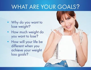 This document provides information about healthy weight loss and the TLS Weight Loss Solution program. It discusses setting goals for weight loss, common struggles that prevent weight loss, and why many commercial programs fail. The TLS program teaches eating a low-glycemic diet of whole foods, helps change behaviors, focuses on fat loss over weight, and provides meal plans and supplements to help reach goals. It includes options for a 7-day cleanse, 14-day Fat Shredder program, and 6-12 week Rapid Results program.