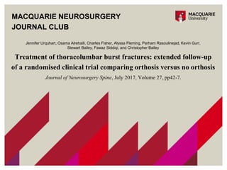 This document summarizes a journal club discussion on a study comparing orthosis versus no orthosis for treatment of thoracolumbar burst fractures. The study was a follow up of patients from 5-10 years after an initial randomized trial. It found that at long term follow up, patients treated with early mobilization without orthosis had similar functional outcomes and pain levels as those initially treated with a thoracolumbar orthosis brace. However, the follow up study had a small sample size and high risk of bias.