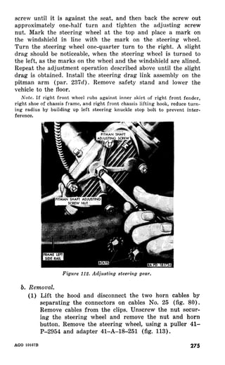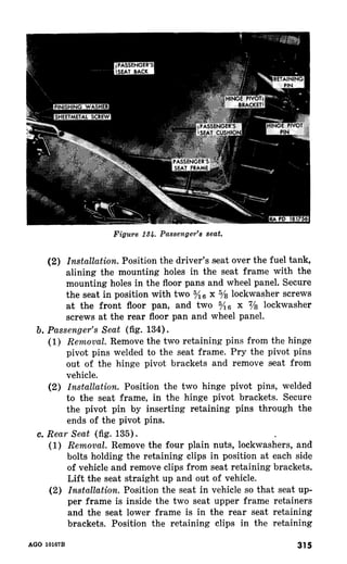 This document provides instructions for operating and maintaining the 1/4-ton 4x4 utility truck M38. It describes the major components of the vehicle, including the 4-cylinder gasoline engine, 3-speed transmission, 2-speed transfer case, front and rear axles, braking and electrical systems. The document outlines the organizational maintenance responsibilities and required reporting procedures for accidents, unsatisfactory equipment, or technical issues.