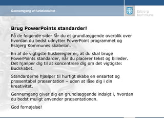 Brug PowerPoints standarder!På de følgende sider får du et grundlæggende overblik over hvordan du bedst udnytter PowerPoint programmet og Esbjerg Kommunes skabelon. En af de vigtigste huskeregler er, at du skal bruge PowerPoints standarder, når du placerer tekst og billeder. Det hjælper dig til at koncentrere dig om det vigtigste: Budskabet. Standarderne hjælper til hurtigt skabe en ensartet og præsentabel præsentation – uden at låse dig i din kreativitet. Gennemgang giver dig en grundlæggende indsigt i, hvordan du bedst muligt anvender præsentationen. God fornøjelse!
