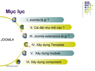 Joomla là một hệ quản trị nội dung mã nguồn mở được phát triển từ năm 2005, sử dụng PHP và MySQL. Tài liệu trình bày chi tiết về cách cài đặt Joomla, cấu trúc, các phần mở rộng và quy trình xây dựng template và module cho Joomla. Nó cũng đề cập đến các ứng dụng của Joomla trong việc phát triển website cho doanh nghiệp, báo chí và các tổ chức.