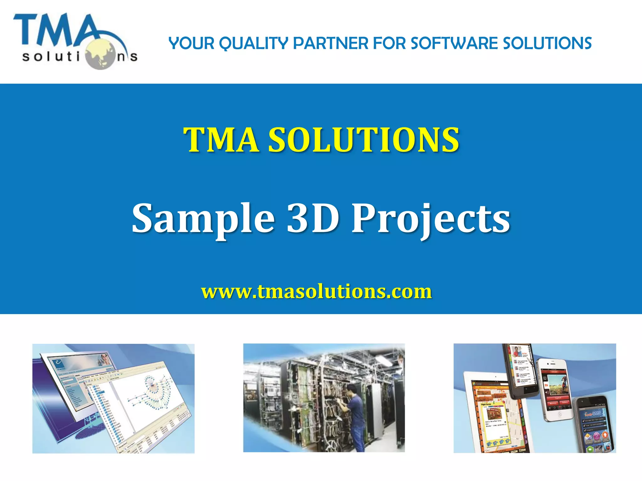 TMA Solutions offers diverse software solutions focused on 3D programming, CAD development, and mobile applications. Their services include enhancements and feature development for 3D CAD modeling, piping systems, commodity handling, and mapping applications, utilizing technologies such as Visual C++ and WebGL. The document outlines various projects along with their scopes, features, and the technologies employed.