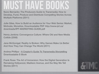 This document provides a summary of resources for transmedia storytelling and digital distribution, including books, articles, platforms, and tools. It lists books on transmedia storytelling, distribution guides and case studies, online video platforms, digital distribution providers, social media for promotion, editing tools, story sharing platforms, mobile gaming resources, wireframing tools, and crowdfunding platforms and guides. The document serves as a comprehensive starting point for creators exploring different aspects of transmedia and digital distribution.