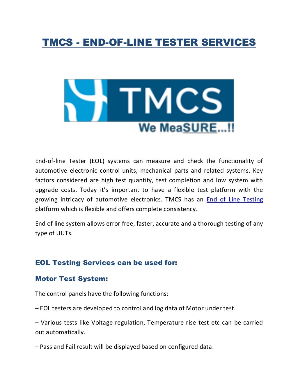 End-of-line Tester (EOL) systems can measure and check the functionality of automotive electronic control units, mechanical parts and related systems. Key factors considered are high test quantity, test completion and low system with upgrade costs.