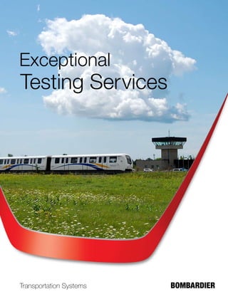 Bombardier Transportation operates a full-service rail testing facility in Kingston, Ontario with four test tracks to test various rail vehicles. The facility has over 30 years of experience testing rail systems and vehicles for clients. It can test metro, monorail, light rail, and heavy rail vehicles at speeds up to 100 km/h. The facility also provides energy management testing and has implemented solutions like EnerGstor to capture regenerative braking energy.