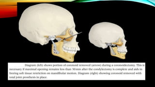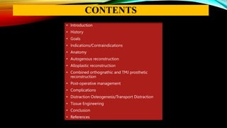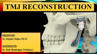 This document provides an overview of temporomandibular joint (TMJ) reconstruction techniques. It discusses the goals of TMJ reconstruction as restoring mandibular ramus length and morphology, an acceptable range of motion, and reestablishing normal jaw relations. Autogenous reconstruction uses the patient's own tissues and permits ongoing growth, while alloplastic reconstruction uses prosthetic devices. Common autogenous grafts discussed are costochondral, sternoclavicular, fibular, iliac crest, metatarsal, and coronoid grafts. Alloplastic options and a combined orthognathic approach are also summarized.
