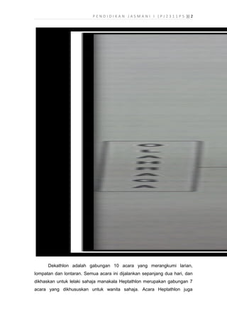 Dokumen ini membahas sejarah dan perkembangan sukan olahraga, serta variasi dan peraturan dalam acara-acara seperti dekathlon dan lontar peluru. Ia mencatatkan kemajuan atlit dari pelbagai latar belakang etnik serta keperluan peralatan yang diperlukan dalam acara olahraga. Dokumentasi ini juga menjelaskan teknik yang diperlukan untuk pertandingan yang berbeza, termasuk latihan dan perlengkapan yang sesuai untuk atlet.