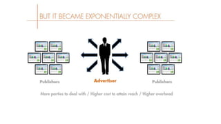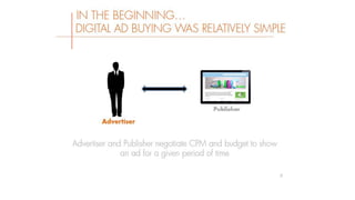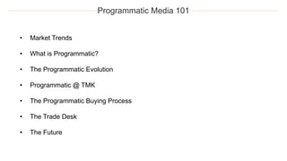 The document provides an overview of programmatic media buying, emphasizing its evolution from centralized trading desks to more decentralized planning teams that enhance transparency and simplify the purchasing process. It defines programmatic media buying as the use of software to automate ad purchasing for targeted audiences, leveraging data for smarter decisions. The document also discusses various programmatic buying types, the significance of audience targeting, and features of demand-side and supply-side platforms.