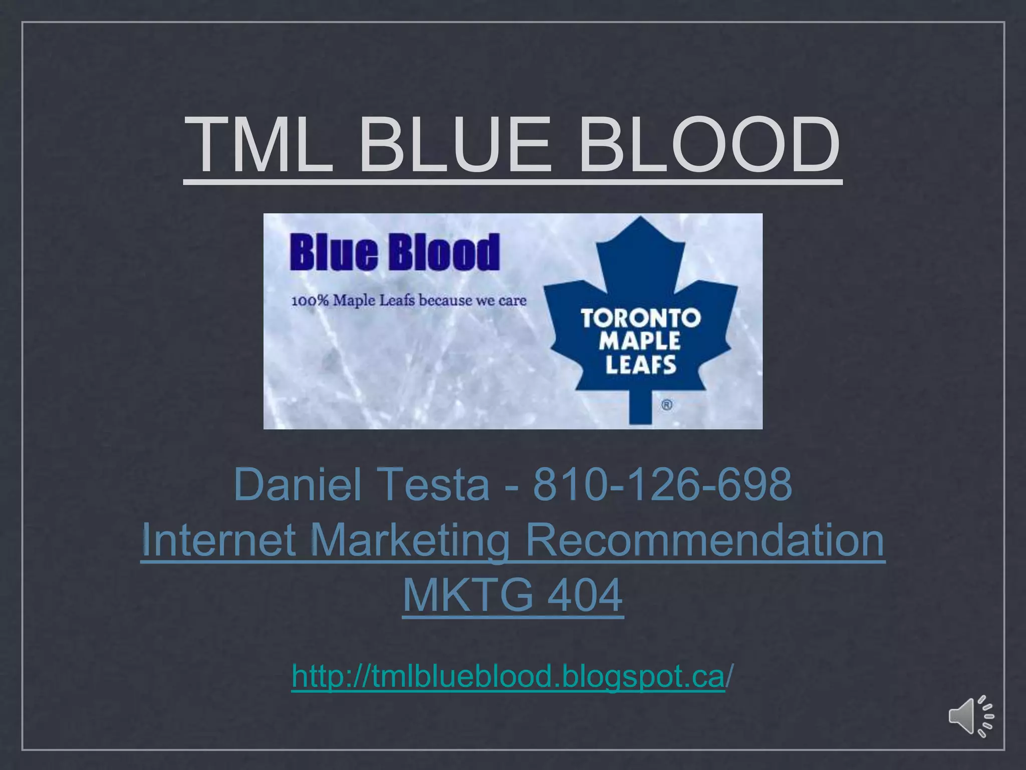 This document summarizes the TML Blue Blood blog, which provides updates on the Toronto Maple Leafs NHL hockey team. The blog has a persona of die-hard Leafs fans and provides straightforward analysis. It is active on social media platforms like Facebook, Twitter, YouTube and Pinterest to engage with other Leafs fans. The document recommends expanding blog content, optimizing for search engines, running social media campaigns, and using affiliate marketing and email marketing to promote the blog and reach more Leafs fans.