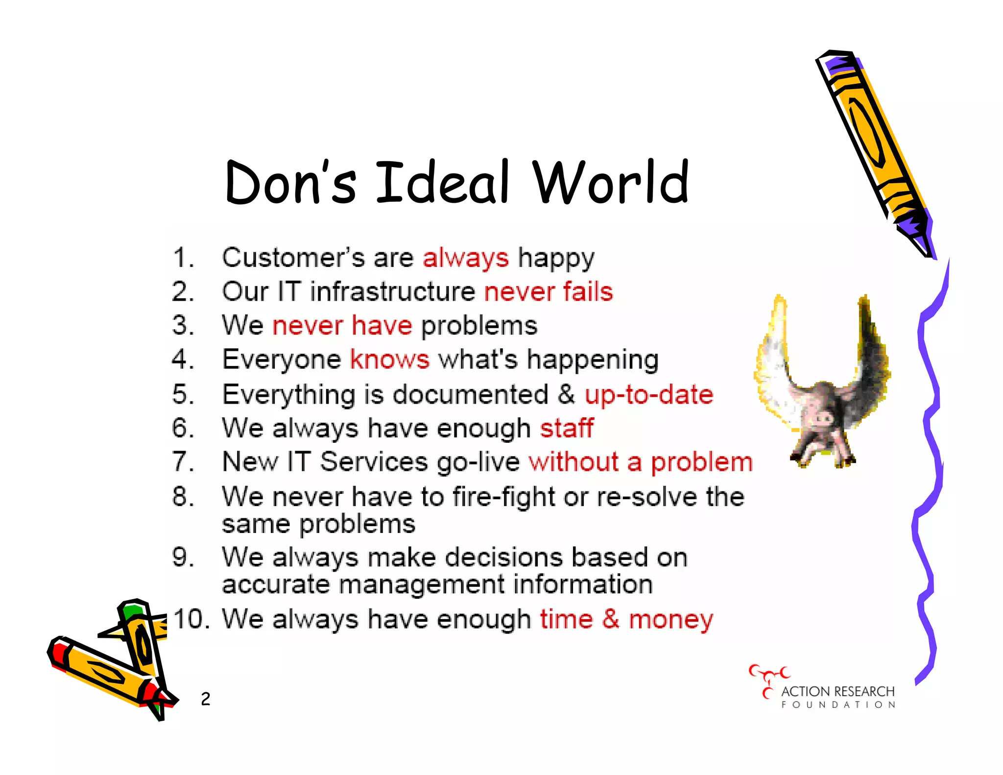 The document presents a demand-driven, service-oriented management framework designed to align business strategy with operations and IT management in a secure outsourced environment. It outlines key components, including the necessity of collaboration among stakeholders, adherence to international standards like ISO 20000, and the transition to service-focused ICT delivery. Additionally, it emphasizes the critical management concerns for IT leaders and the proposed milestones for implementing essential service management processes.