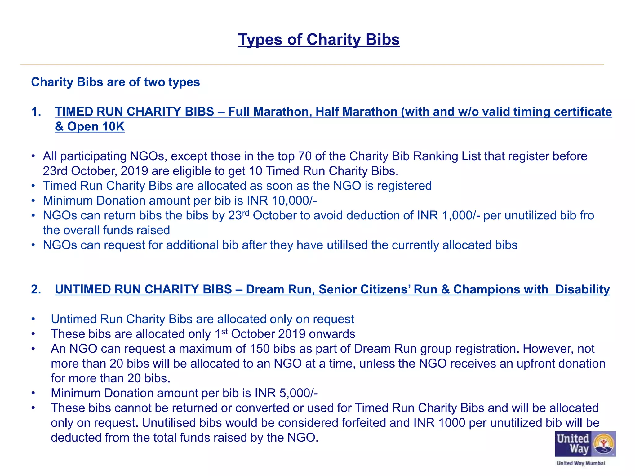1. There are two types of charity bibs - timed run bibs which require a minimum donation of INR 10,000 and provide entry to full and half marathons, and untimed run bibs which are for dream runs and have a minimum donation of INR 5,000.