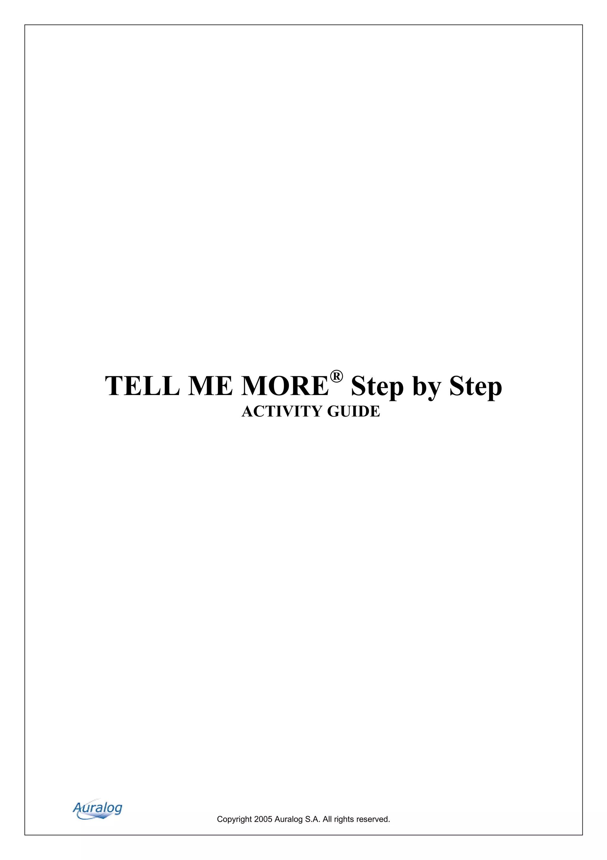 This document provides a step-by-step guide for using the TELL ME MORE language learning software. It describes the different lesson modes: Free-to-Roam mode which allows customization, Guided mode which structures learning along learning paths, and Dynamic mode which adapts based on student performance. It also summarizes the main components and objectives of different activity types, such as dialogues, word searches, and sentence building exercises. Guidance is provided for how to best complete each activity and access additional resources.