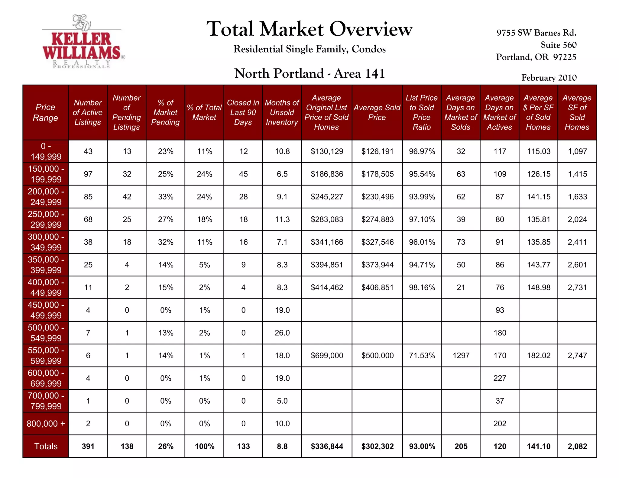 This document provides a summary of the residential housing market in three areas of Portland, Oregon in February 2010. It includes data on active and pending listings, homes sold, average prices, days on market and price per square foot for different price ranges. The number of active listings was highest in Southeast Portland at 1,217 and lowest in Northeast Portland at 967. Average original list prices and sold prices varied by area and price range, with higher end homes generally taking longer to sell.