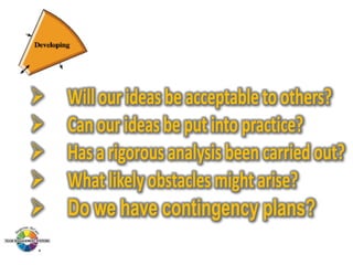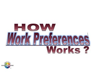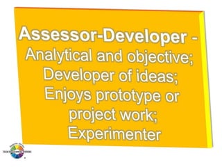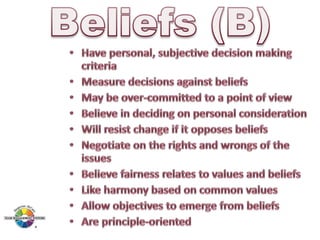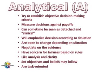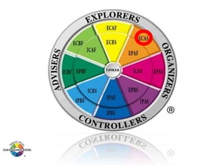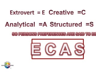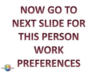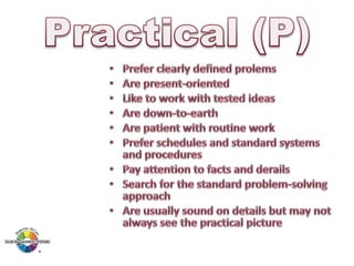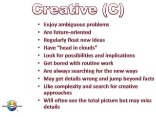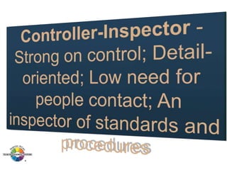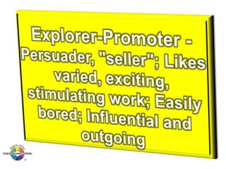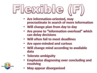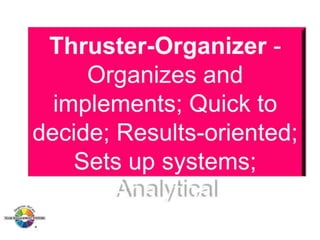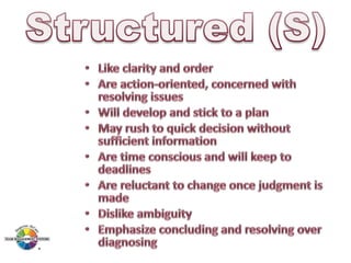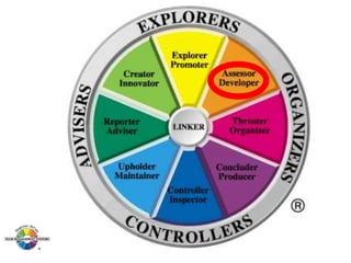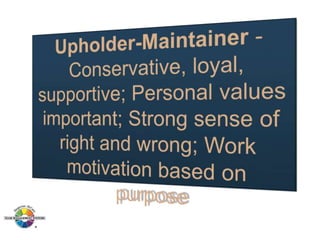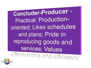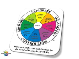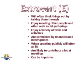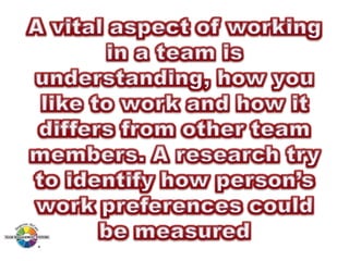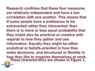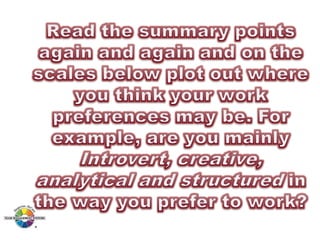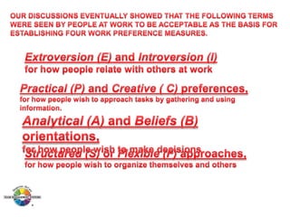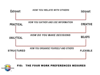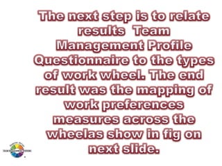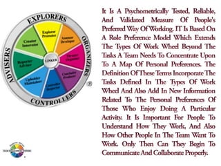The document outlines the Margerison-McCann types of work wheel, detailing eight work functions: advising, innovating, promoting, developing, organizing, producing, inspecting, and maintaining. It also describes various work preferences based on Jung's psychological types, such as extroversion vs. introversion and practical vs. creative approaches, and introduces different team management roles that align with these preferences. These frameworks aim to enhance organizational effectiveness by addressing how individuals can best contribute to teams and projects.