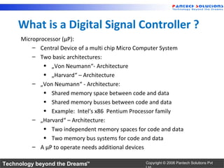 The document provides an overview of digital signal controllers (DSCs) and their architecture, specifically focusing on the Texas Instruments TMS320F2812. It details the components of microprocessors, microcontrollers, and digital signal processors, and explains the advantages of integrating these components into a single chip for real-time control applications. Additionally, it highlights various DSP algorithms and compares programming implementations on microprocessors and DSPs.
