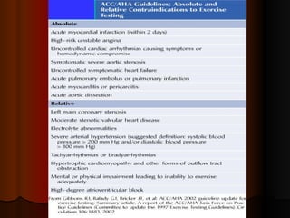 2) Safety precautions and equipment are required, and protocols like the Bruce protocol are commonly used to gradually increase workload over stages.
