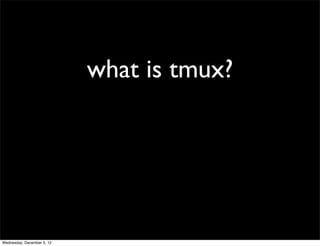 Tmux is a terminal multiplexer that allows users to open multiple terminal sessions inside a single window. It enables users to switch between various programs in different terminal sessions. The document discusses how the author installed tmux locally by compiling the source code instead of waiting for it to be installed on a sandbox server. Various tmux commands are also explained, such as splitting panes, moving between windows, and customizing the tmux configuration file.