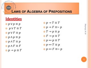 This document outlines the laws of algebra for propositional logic, including identities, commutative laws, associative laws, distributive laws, De Morgan's laws, and other logical equivalences. It defines tautologies as statements that are always true regardless of the truth values assigned to variables, and contradictions as statements that are always false. Examples of truth tables are provided to demonstrate tautologies, contradictions, and logical equivalence between statements. The document concludes by posing questions to classify logic formulas as tautologies, contradictions, or contingencies using truth tables and the laws of propositional logic.