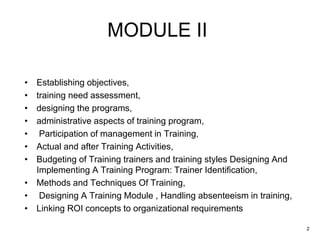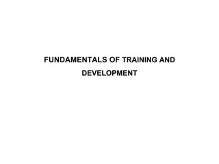 The document discusses the fundamentals of training and development, including establishing objectives, assessing training needs, designing training programs, and evaluating training. It covers analyzing organizations, jobs, and individuals to identify training needs. The key aspects of designing a training program are determining objectives, content, activities, selecting trainers and participants, duration, location, and required resources. The goal is to address needs identified in the needs assessment to improve performance.