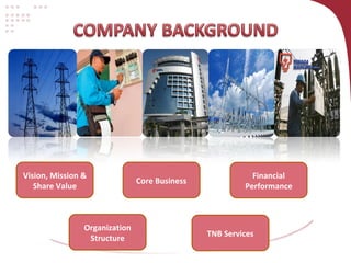 This document provides an overview of Tenaga Nasional Berhad (TNB), Malaysia's largest electric utility company. It outlines TNB's vision, mission, core values, business divisions, core and non-core businesses, generation and transmission assets, and organization structure in 3 paragraphs or less.