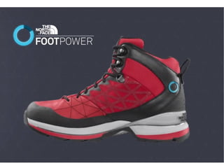 The document summarizes The North Face's hiking product line for Spring/Summer 2015. Key features of the product include a device that harnesses kinetic energy from walking to charge small electronics and provides location tracking, stats monitoring, and SOS signaling. The target audience includes athletes, hikers, backpackers, and others with active lifestyles. Competitors include shoes from ZAPPS Global and Adidas that also generate power and provide GPS tracking during activities.