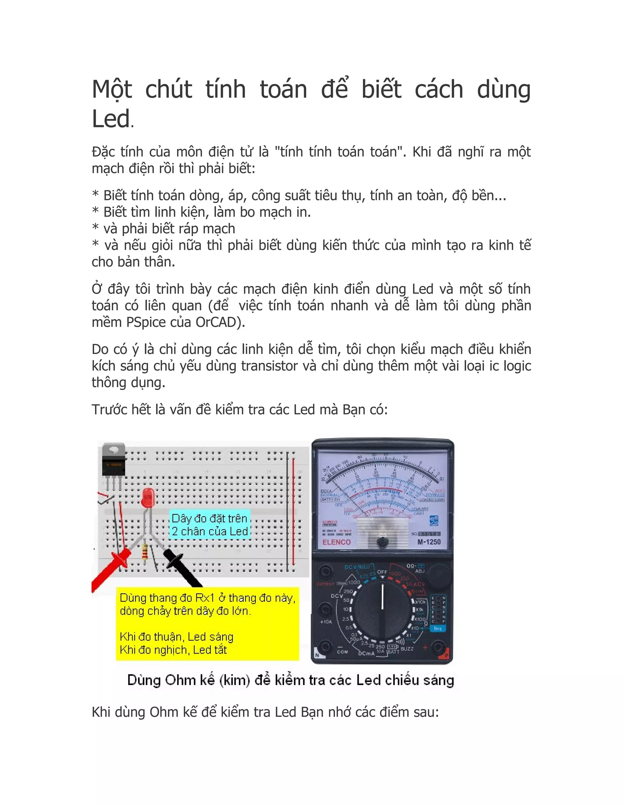 Tài liệu hướng dẫn về cách sử dụng và đo led trong mạch điện, nhấn mạnh tầm quan trọng của việc tính toán dòng, áp và công suất tiêu thụ. Nó bao gồm các thực hành thực tiễn với pspice, việc kiểm tra led với ohm kế, và các lý thuyết cơ bản về transistor như npn và pnp cùng với cách kiểm tra chúng. Cuối cùng, tài liệu cũng đề cập đến nguyên lý hoạt động của tụ điện và mạch RC.