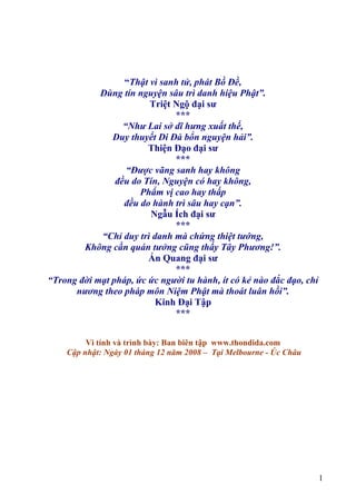 Tài liệu tập hợp các bài viết về tịnh độ và phương pháp niệm phật của lão cư sĩ Lý Bỉnh Nam. Nó giải thích các khó khăn trong cuộc sống, tai nạn, và luân hồi, đồng thời đưa ra phương pháp niệm phật giúp vượt qua những thử thách này. Cuối cùng, tài liệu nhấn mạnh tầm quan trọng của tín, hạnh và nguyện trong việc đạt được vãng sanh về cõi cực lạc.