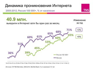 Документ представляет собой анализ динамики проникновения интернета в России с 2005 по 2012 годы, демонстрируя рост пользователей и частоту использования. За исследуемый период отмечен рост числа интернет-пользователей, а также увеличение популярности мобильного интернета, особенно среди молодежи. В документе также представлены данные о посещаемости различных интернет-платформ и статистика по типам используемых мобильных устройств.