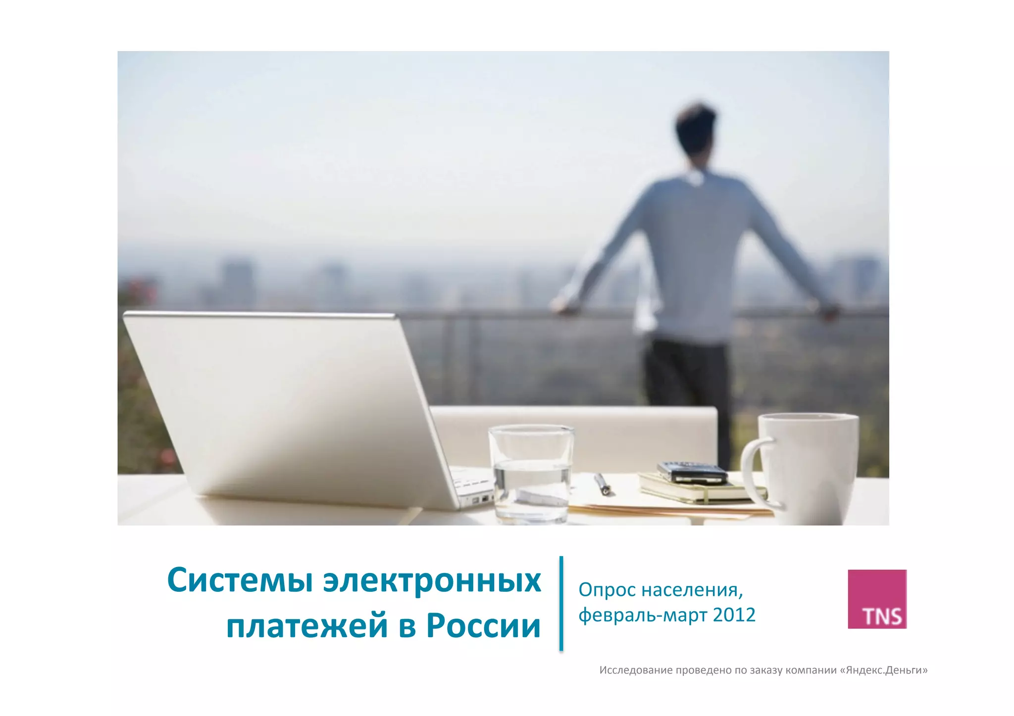Документ описывает исследование использования электронных денег в России, проведенное в феврале-марте 2012 года по заказу Яндекс.Деньги. В нем указано, что 12,3 миллиона россиян в возрасте 18-45 лет знают о современных способах оплаты, из которых 3,9 миллиона активно пользуются электронными деньгами. Яндекс.Деньги является самой известной и используемой системой среди пользователей.
