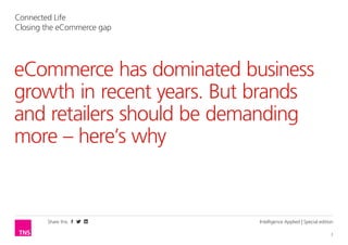 The document discusses the persistent gaps between ecommerce potential and reality, revealing that less than half of online research results in a purchase. It emphasizes the importance of understanding specific barriers to ecommerce, which vary by market and product category, as well as the need for tailored solutions to overcome these obstacles. Additionally, it highlights opportunities for businesses to enhance the online shopping experience and capitalize on the considerable growth potential if they can effectively close these gaps.
